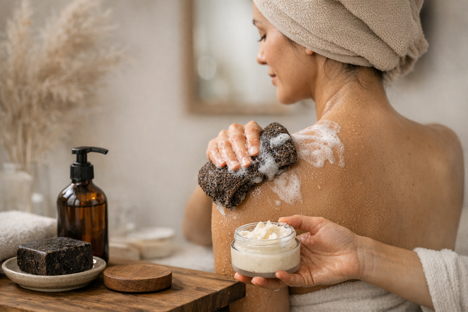 Duschhandduken exfolierar skonsamt och maximerar effekten.